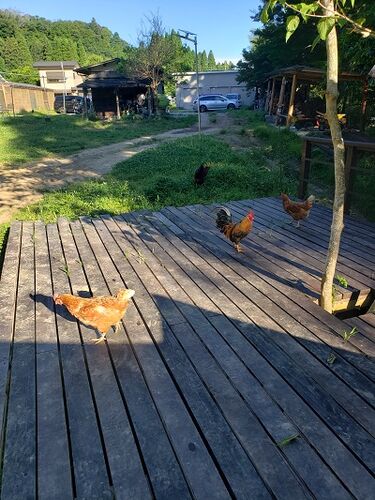 ■良いキャンプ場の帰り道は気持ちいい。 朝5時過ぎ。鶏達が起こしに来てくれました。 鳴き声じゃなく、足音で目が覚めます。(笑) 鶏達で目が覚める ●コーヒーを飲みながら コーヒーを飲みながら朝食のメニューを考える。(本当に適当だな) 朝の一杯 メス…